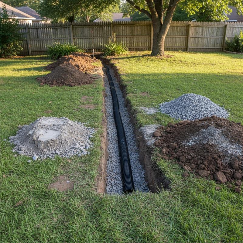 French drains are one of the most popular and effective ways to redirect groundwater. These systems use a perforated pipe buried in gravel to collect and channel water away from low-lying or problem areas. Perfect for: